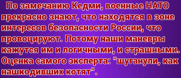 Т.е., сообщает Кедми, в зоне визуальной близости к ВМС НАТО Россия обнаружила те средства, которые НАТО изображали - и ракетными пусками наглядно показала, что с ними будет. Часть флота "партнеров" попросту сбежала в Ср.море под прикрытие авианосной группы.
