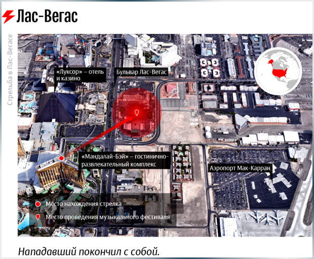 По данным полиции, мужчина стрелял с 32-го этажа гостиничного комплекса Mandalay Bay Hotel по посетителям фестиваля кантри-музыки, проходившего неподалеку. Жертвами инцидента стали не менее двадцати человек, еще более ста пострадали, заявил шериф Лас-Вегаса Джозеф Ломбардо. Полицейские ищут знакомую злоумышленника, проживавшую с ним в одном номере - женщину по имени Мэрилу Дэнли. РИА Новости.